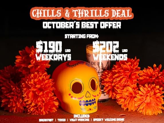 This October, experience the ultimate getaway with our Chills & Thrills Deal at Peñasco del Sol! Stay starting at $190 USD weekdays and $202 USD weekends, including breakfast, taxes, valet parking, and a spooky welcome drink.